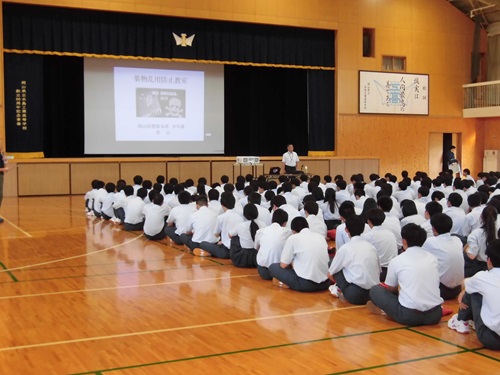 薬物乱用に関するDVDの視聴を交えながら、違法薬物の種類や使用によって起こる依存の怖さ、心身への影響や、周りの人たちへ与える影響について、わかりやすく御講演いただきました。また、全国・岡山県内の薬物情勢、低年齢化する違法薬物に関する事例等も紹介していただいたことで、身近にある違法薬物の危険性について再確認することができました。 講演の中では、違法薬物の使用を誘われた際にどのように断わるのか、生徒同士でロールプレイを行い、断りにくい状況でどのように行動したらよいのか、学ぶことができました。
