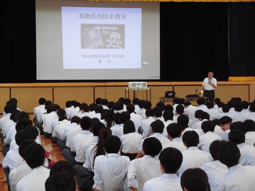 10/7(火)に2年生を対象に安全教育LHRを行いました。岡山県警察本部 生活安全部少年課 健全育成推進専門員 香山 和也 様を講師にお招きし、薬物乱用防止についてご講演いただきました。