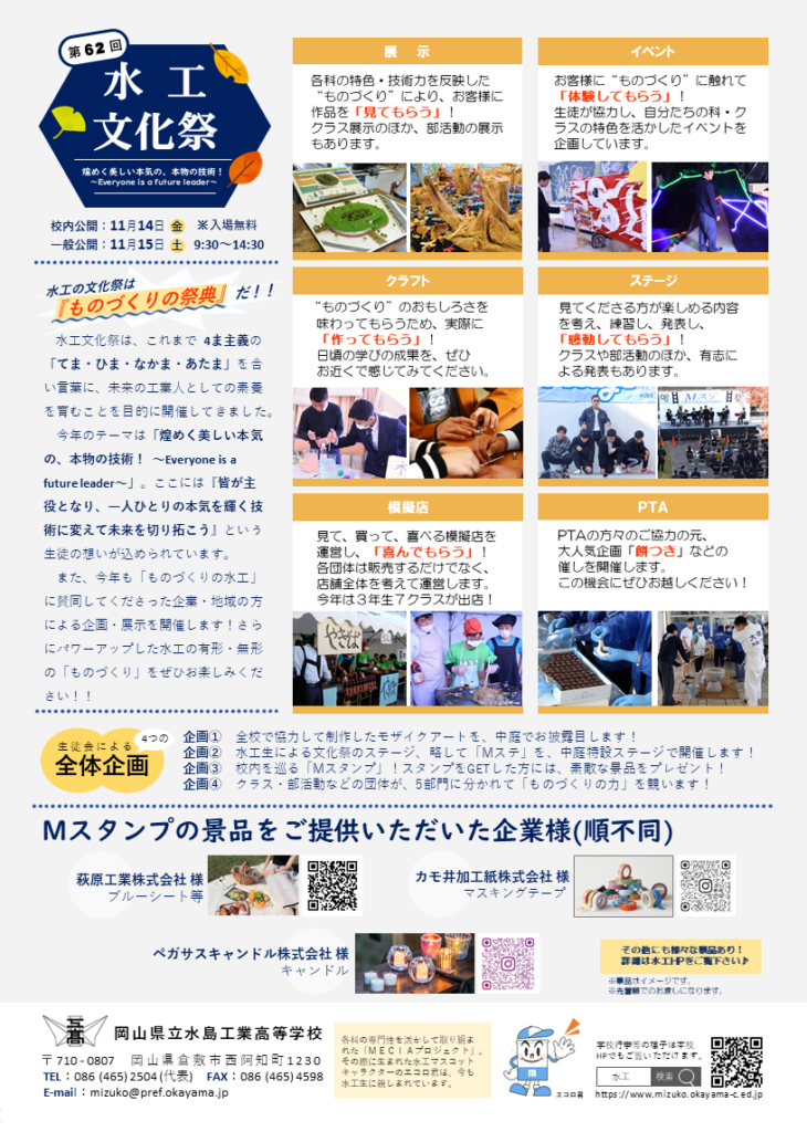 今年の水工文化祭では、各クラスや部活動が趣向を凝らした展示や体験型イベントを企画しています。また、3年生を中心に7店舗の模擬店を設営し、PTAの皆様によるおしるこや喫茶コーナーもご用意いただいております。