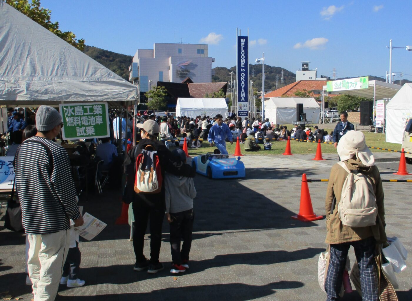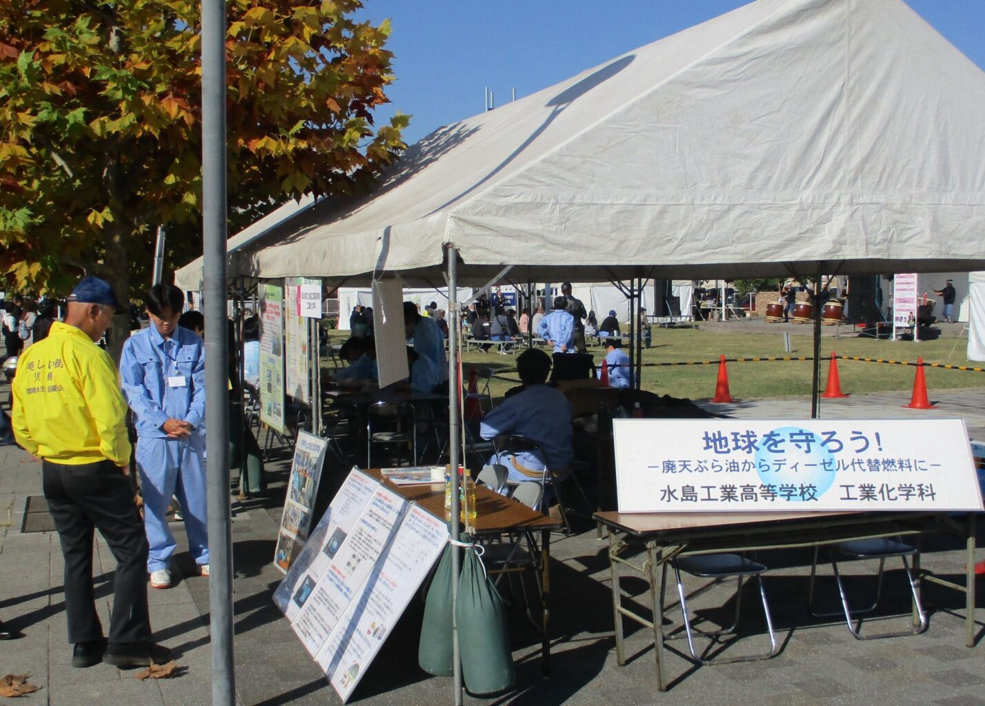 令和7年11月16日、児島駅前広場にて「くらしき環境フェア」が開催されました。工業化学科は倉敷地域から回収した廃食用油をリサイクルし、バイオディーゼル代替燃料の製造を行う実習内容の展示を行いました。また、環境に優しい次世代エネルギーである水素を燃料としたMECIA水素燃料電池カートの試乗体験を行いました。ボランティアとして活動してくれた生徒も自分より小さい児童と楽しくコミュニケーションを取りながら活動してくれました。次回は12月13日に水島愛あいサロンにおいて開催される「STOP温暖化くらしき」に参加、発表します。是非、水工生の頑張りを見に来てください。