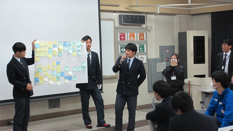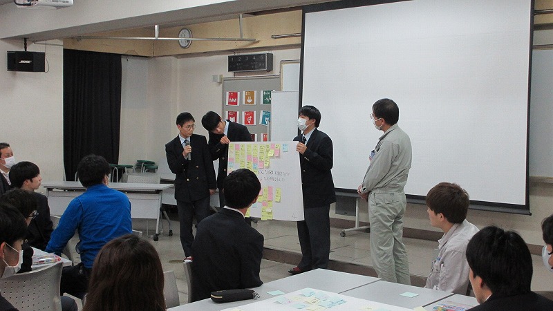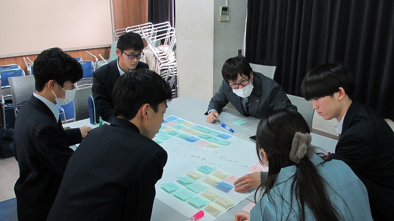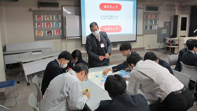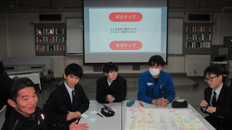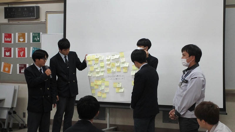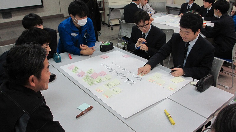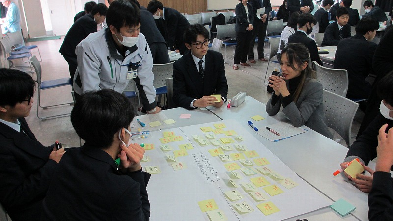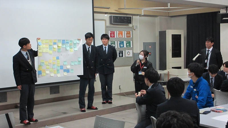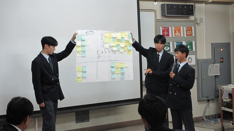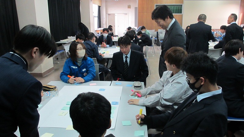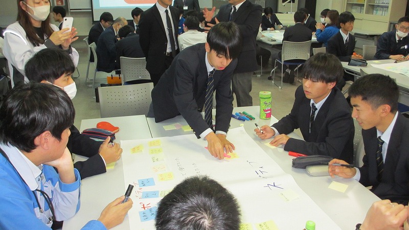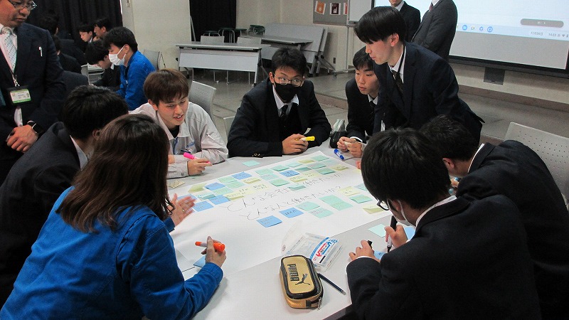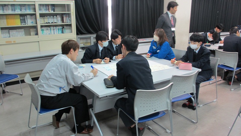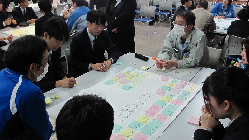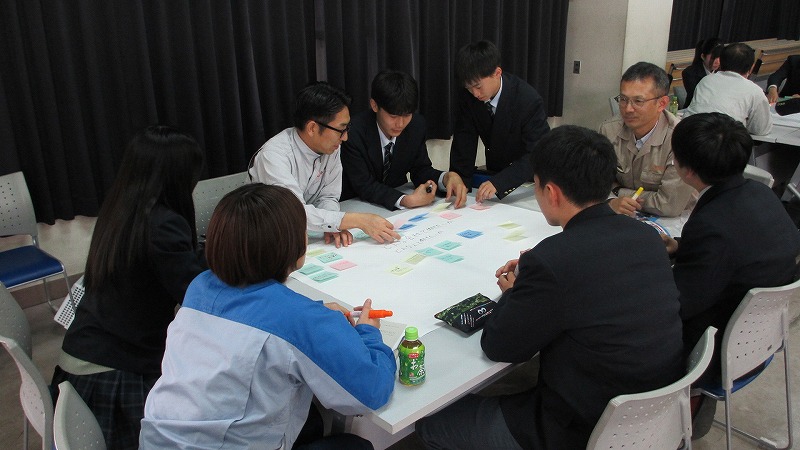 プログラムは ①交流会の説明 ②自己紹介 ③ アイスブレイク「10年後のわたし!」 ④グループワーク「どんな会社で働きたいか、どんな人と働きたいか?」 ⑤ポスターセッション ⑥まとめ の順で実施しました。各グーループとも、生徒、企業担当者の活発な意見が出て、大変な盛り上がりでした。お互いに多くのことを学び、有意義な時間となりました。
