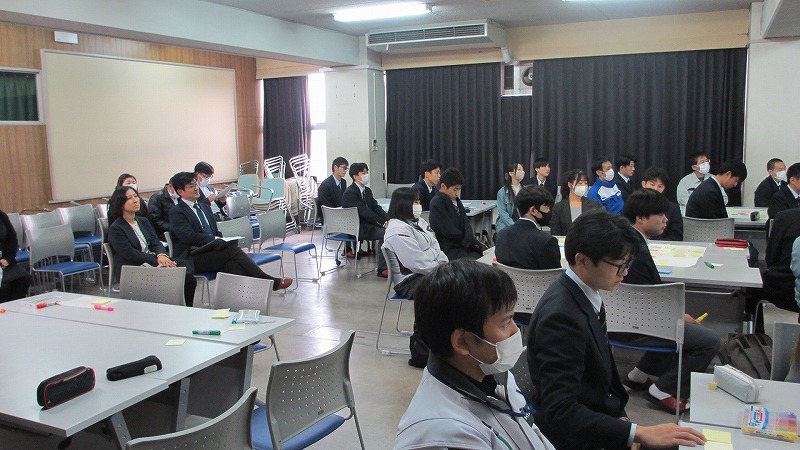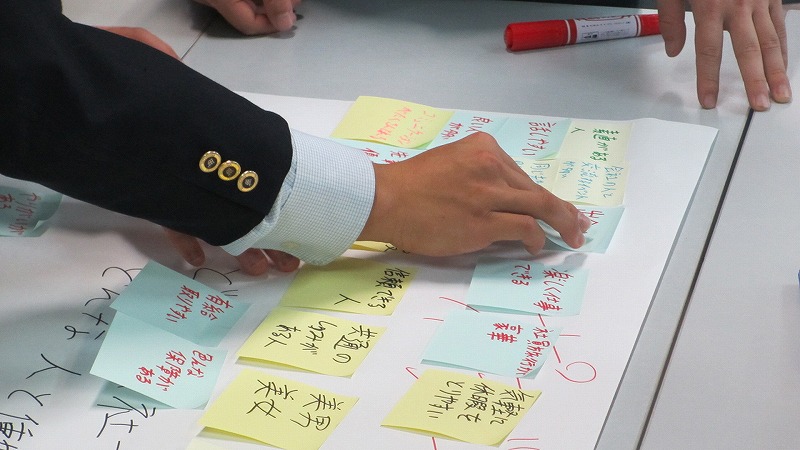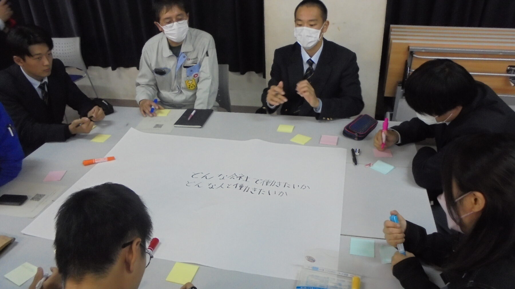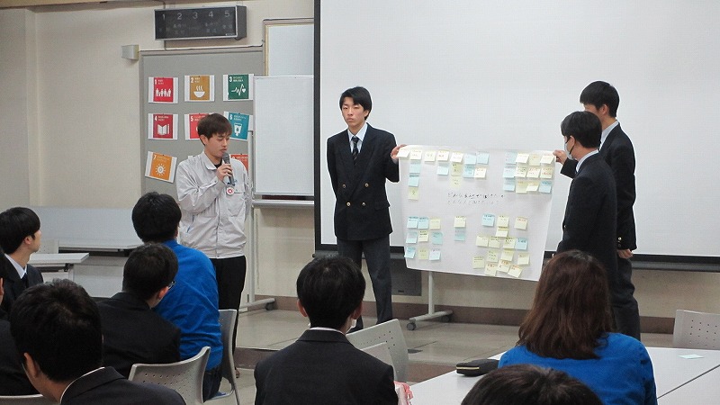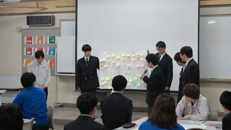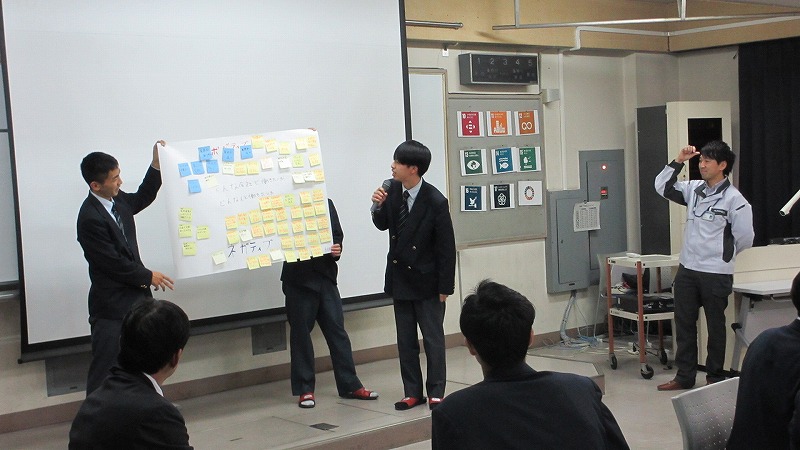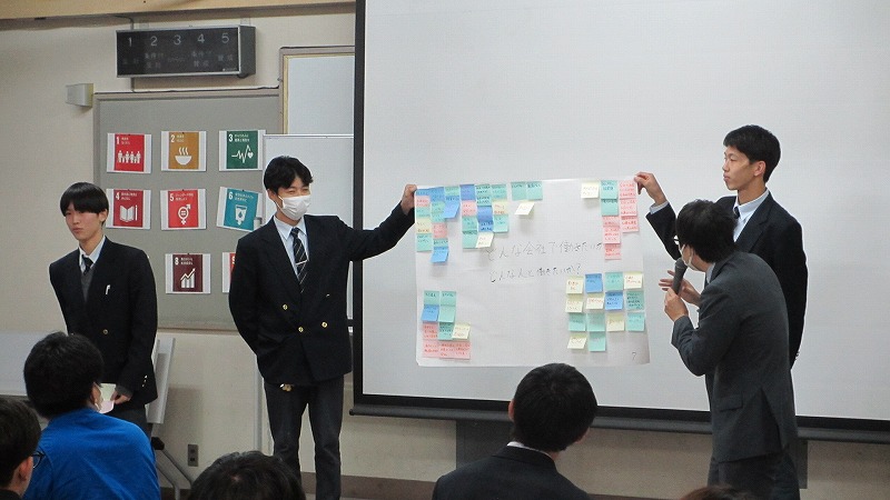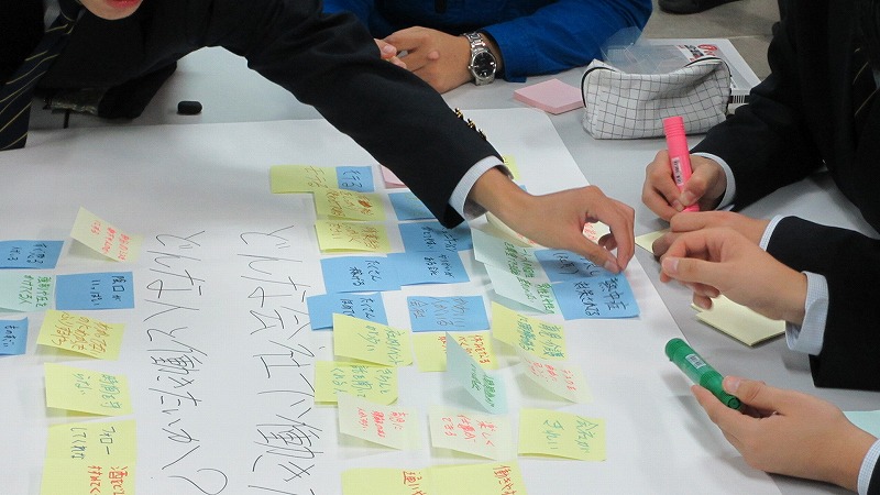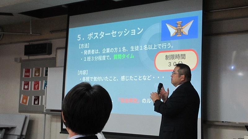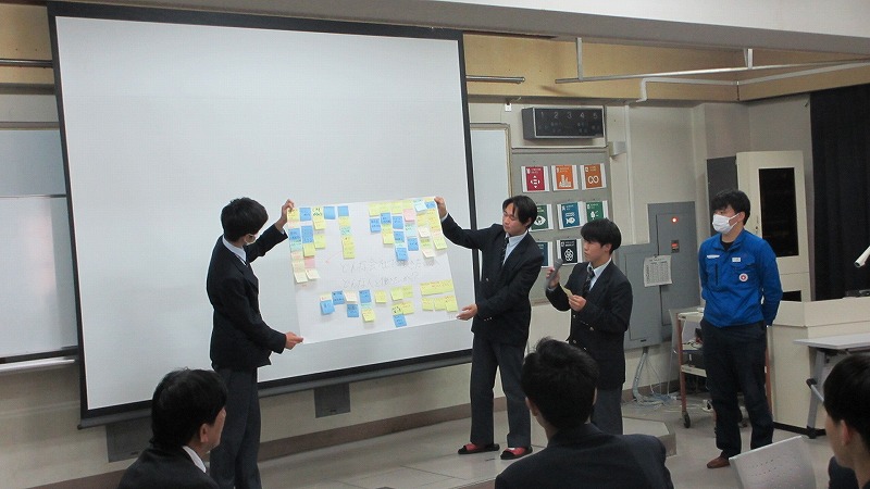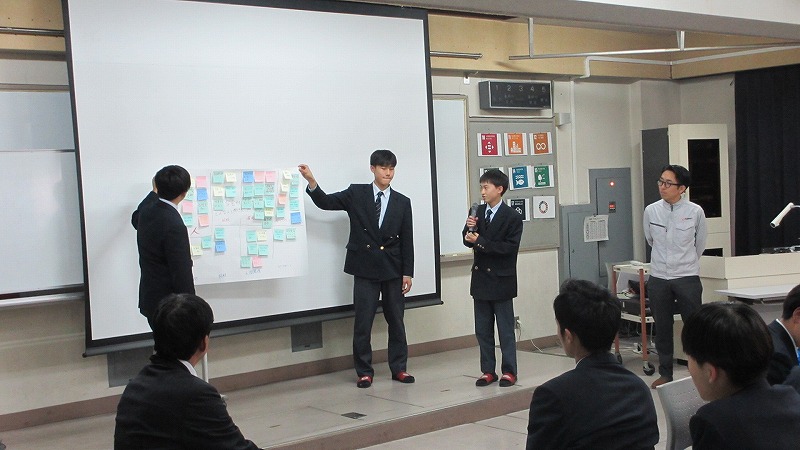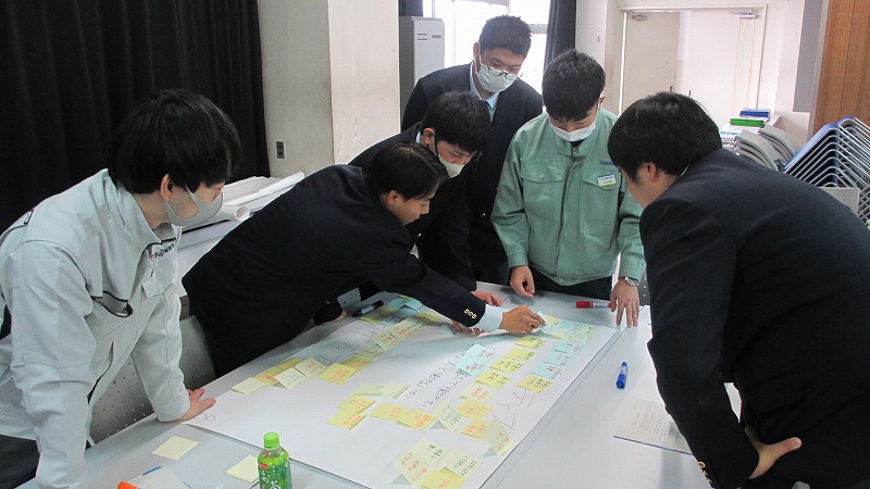 プログラムは ①交流会の説明 ②自己紹介 ③ アイスブレイク「10年後のわたし!」 ④グループワーク「どんな会社で働きたいか、どんな人と働きたいか?」 ⑤ポスターセッション ⑥まとめ の順で実施しました。各グーループとも、生徒、企業担当者の活発な意見が出て、大変な盛り上がりでした。お互いに多くのことを学び、有意義な時間となりました。