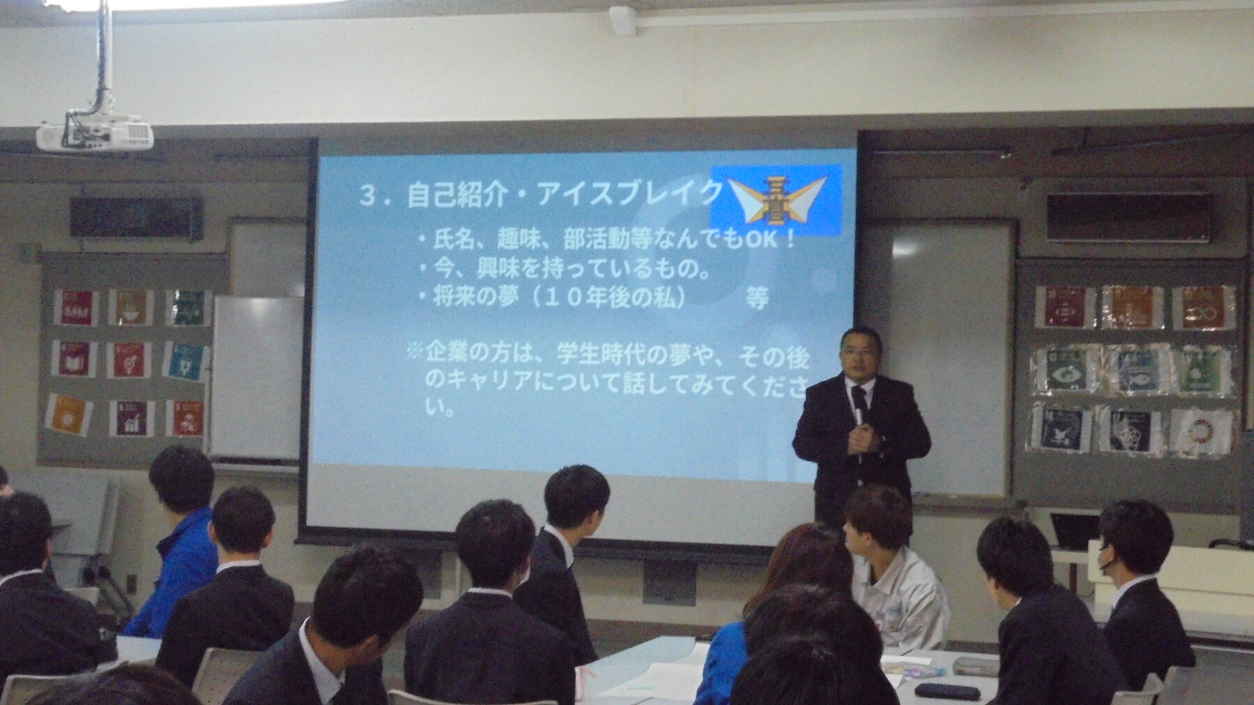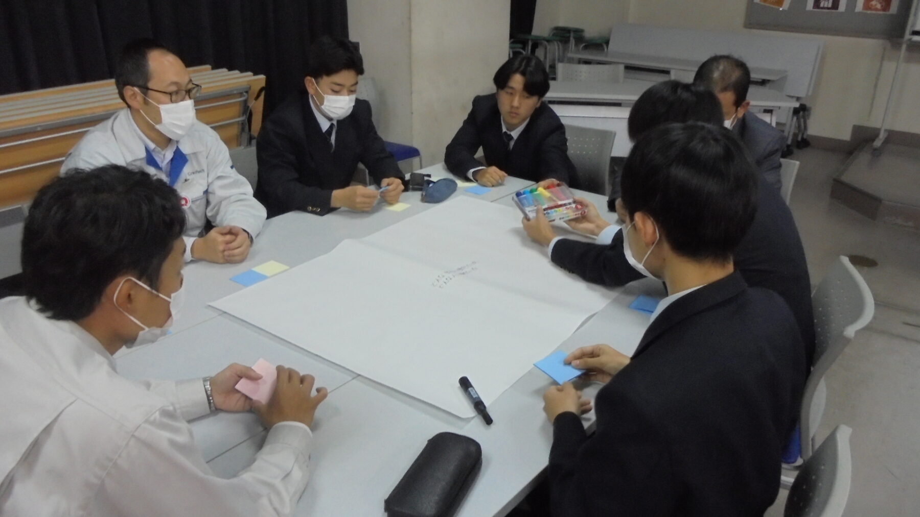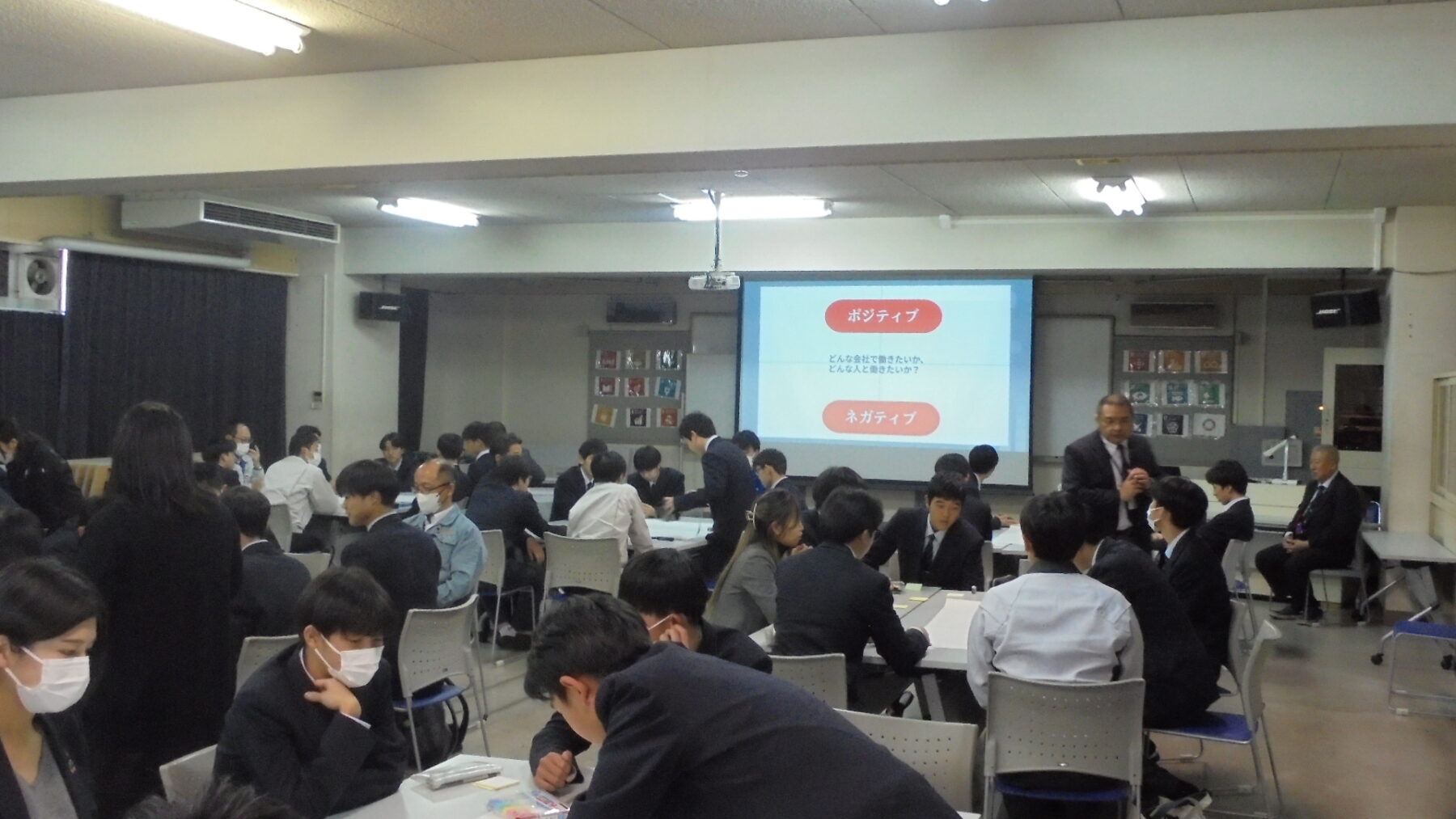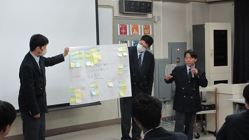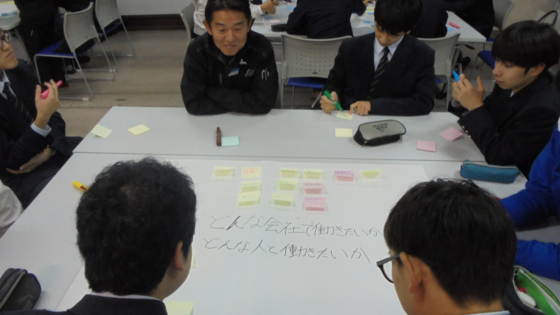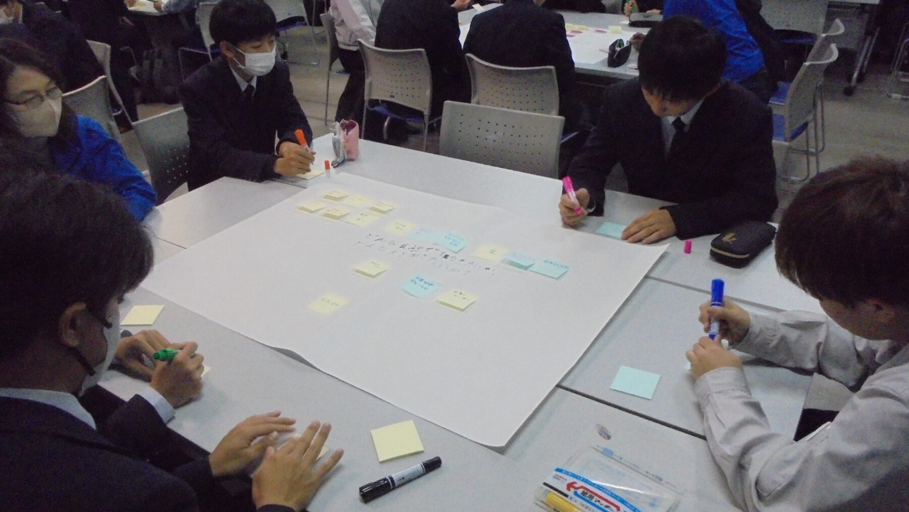 プログラムは ①交流会の説明 ②自己紹介 ③ アイスブレイク「10年後のわたし!」 ④グループワーク「どんな会社で働きたいか、どんな人と働きたいか?」 ⑤ポスターセッション ⑥まとめ の順で実施しました。各グーループとも、生徒、企業担当者の活発な意見が出て、大変な盛り上がりでした。お互いに多くのことを学び、有意義な時間となりました。