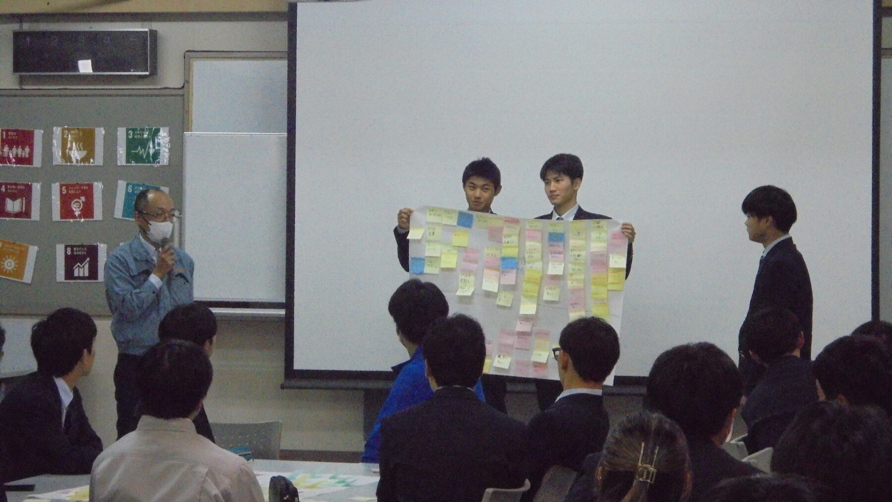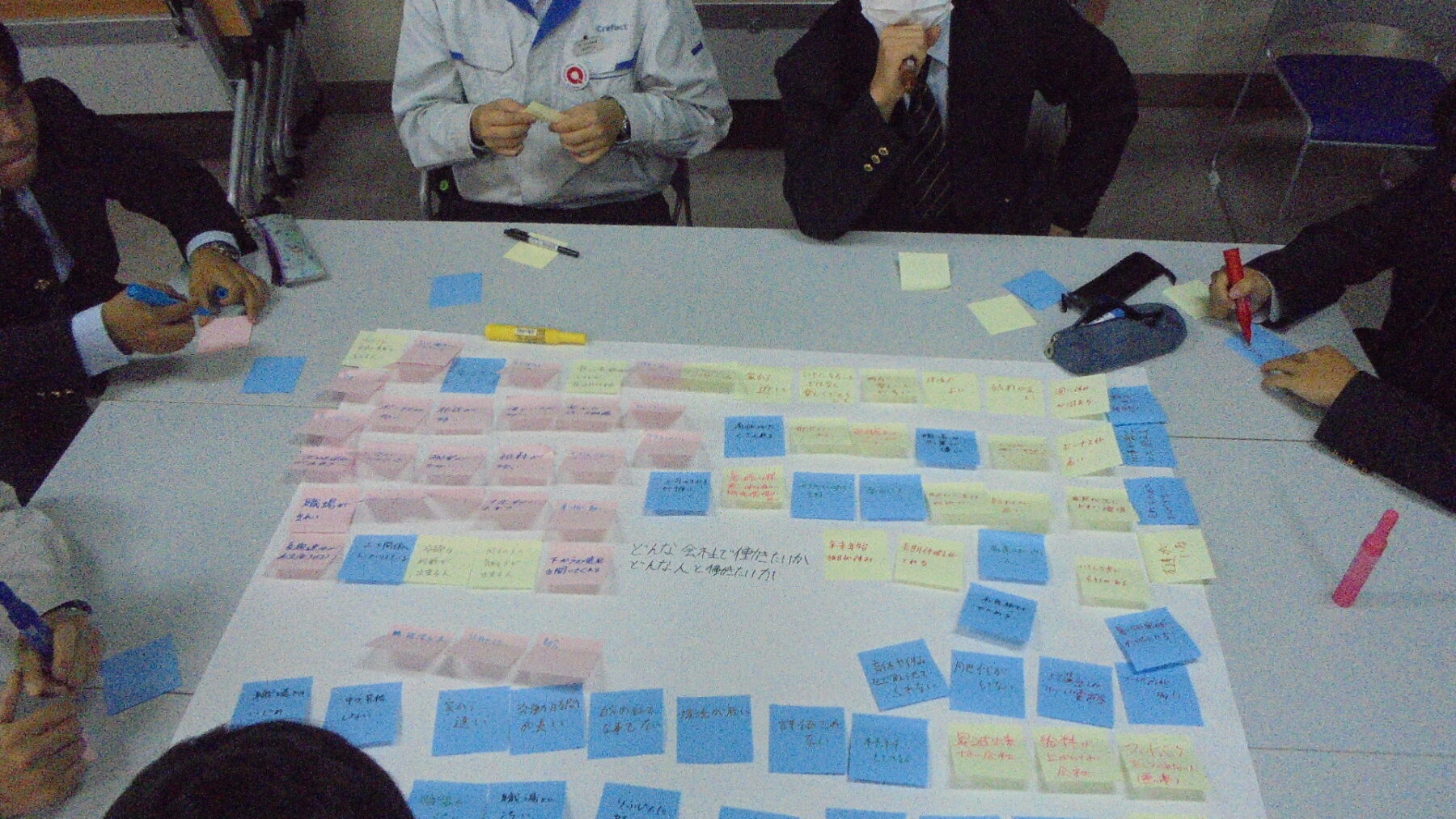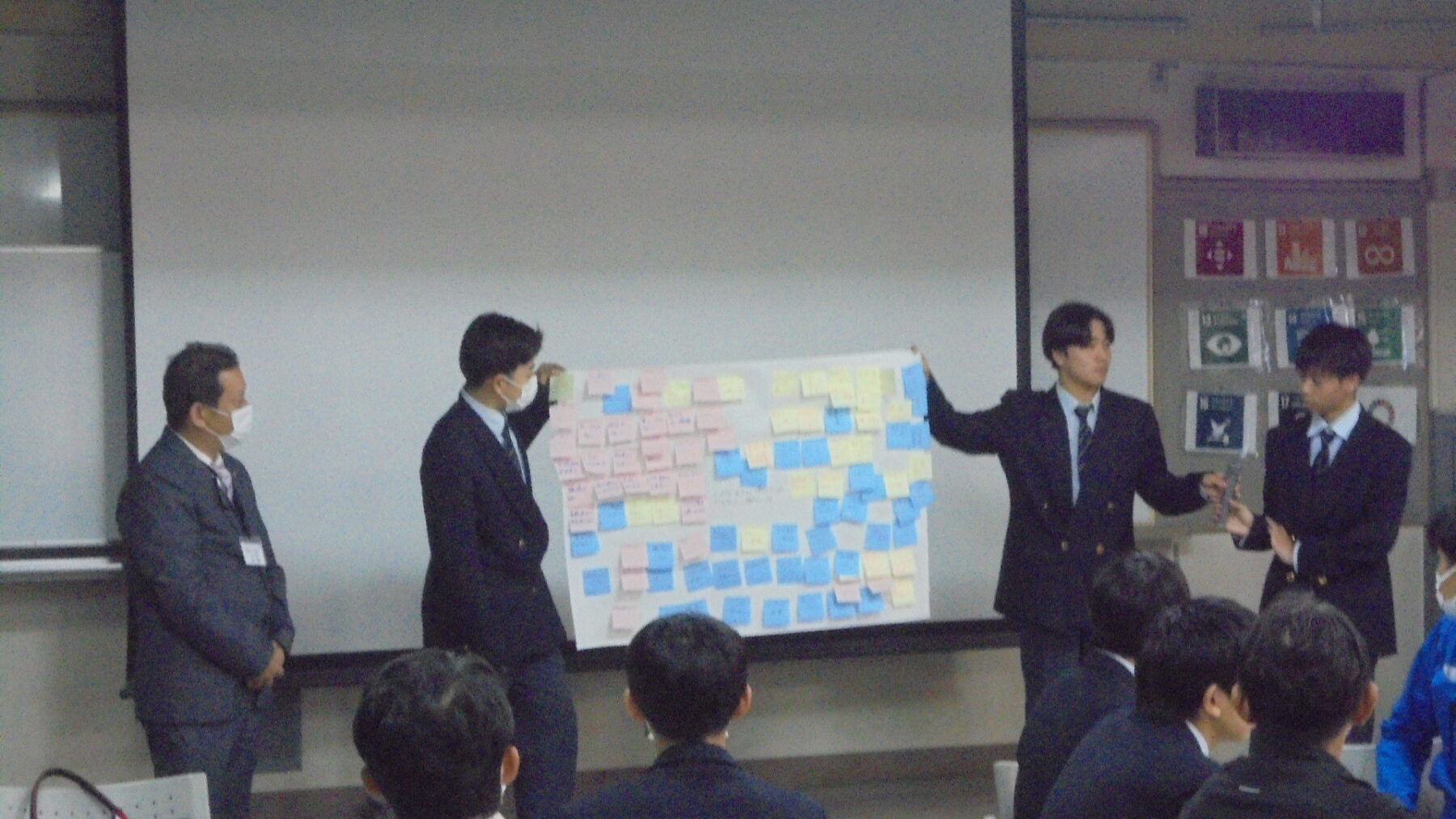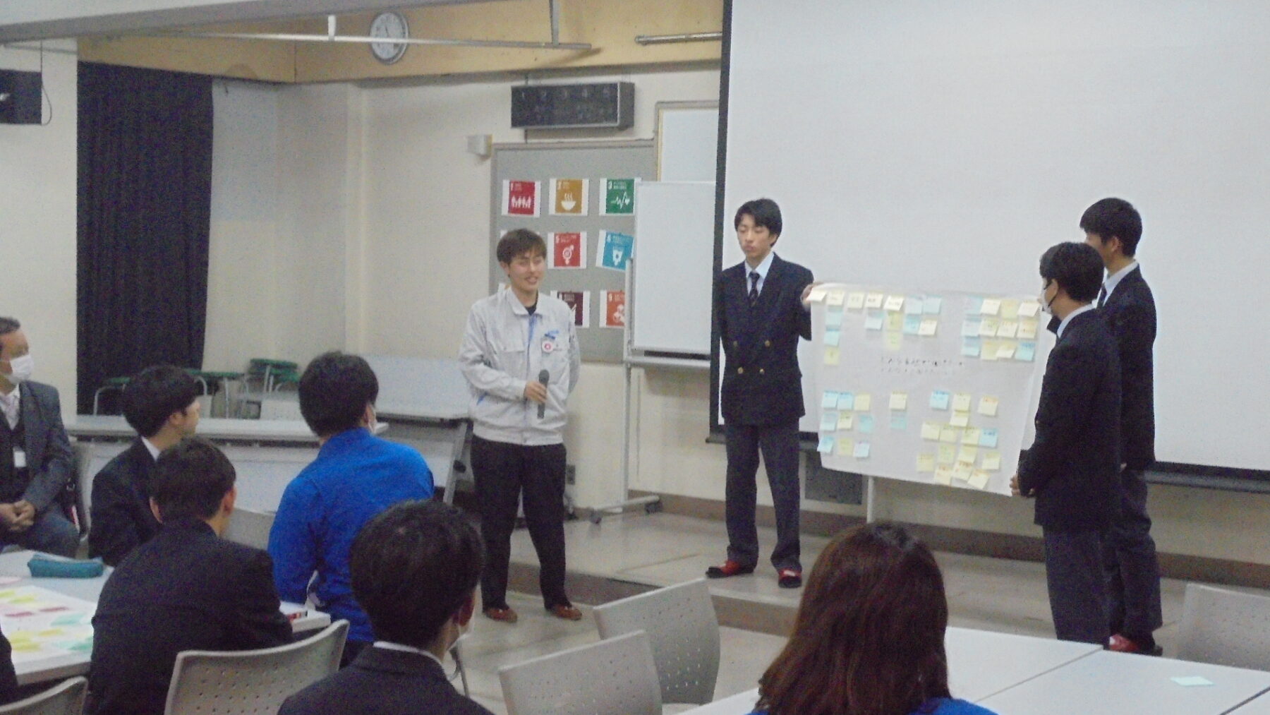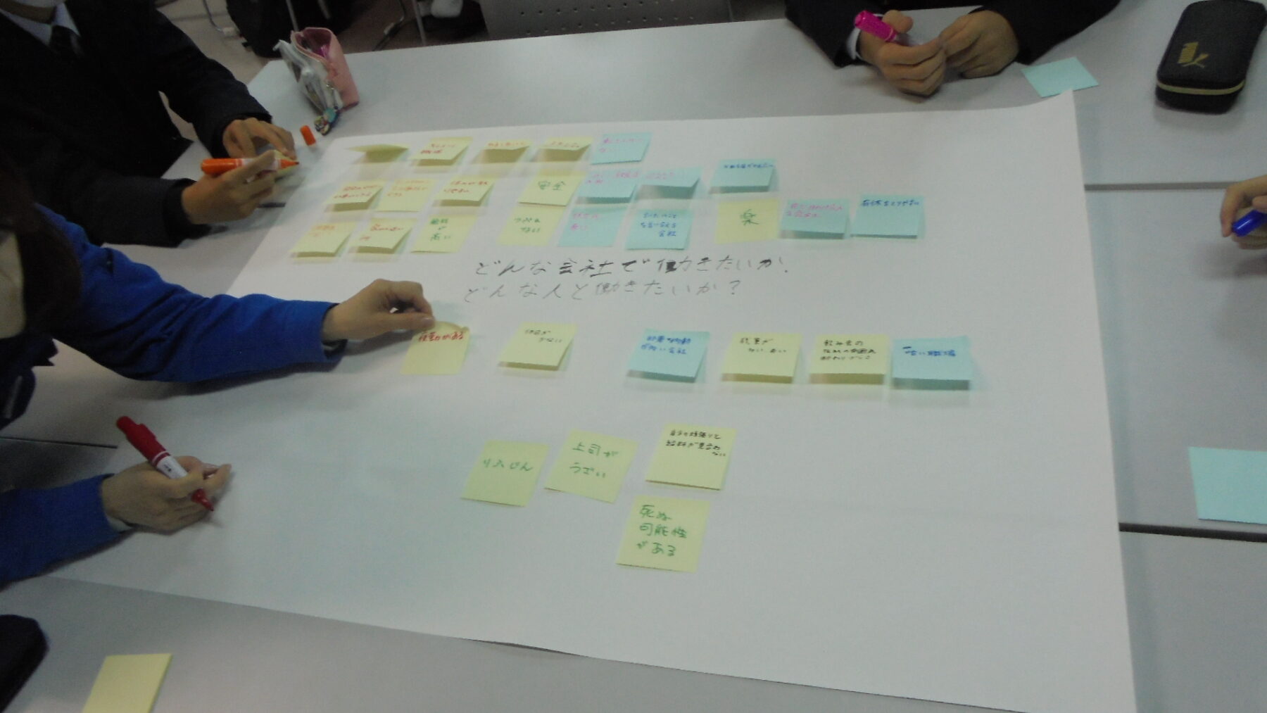 プログラムは ①交流会の説明 ②自己紹介 ③ アイスブレイク「10年後のわたし!」 ④グループワーク「どんな会社で働きたいか、どんな人と働きたいか?」 ⑤ポスターセッション ⑥まとめ の順で実施しました。各グーループとも、生徒、企業担当者の活発な意見が出て、大変な盛り上がりでした。お互いに多くのことを学び、有意義な時間となりました。