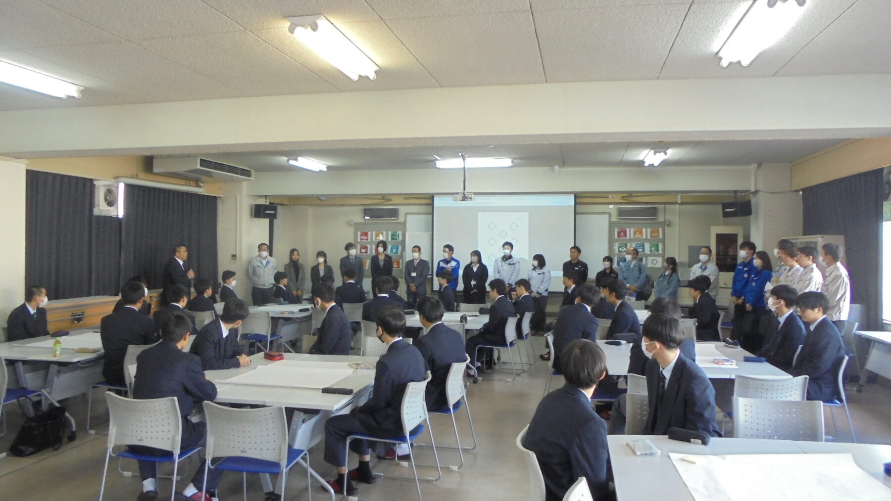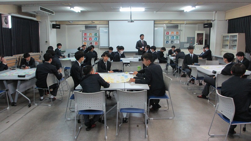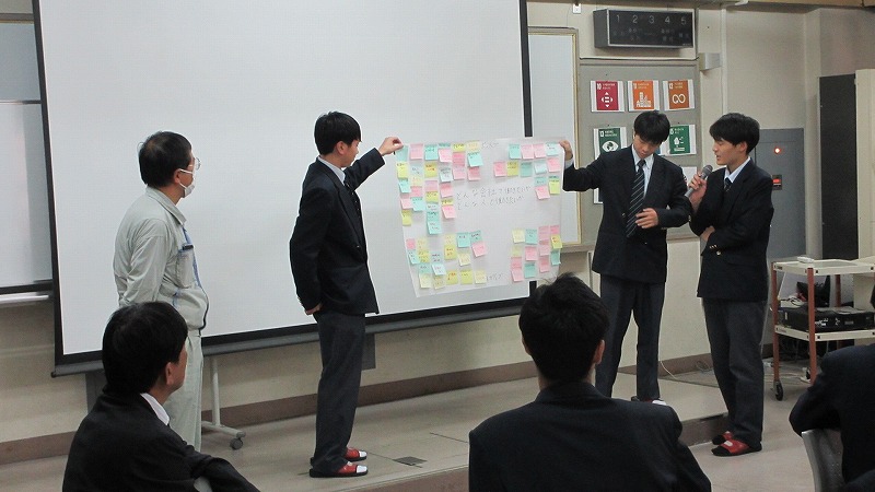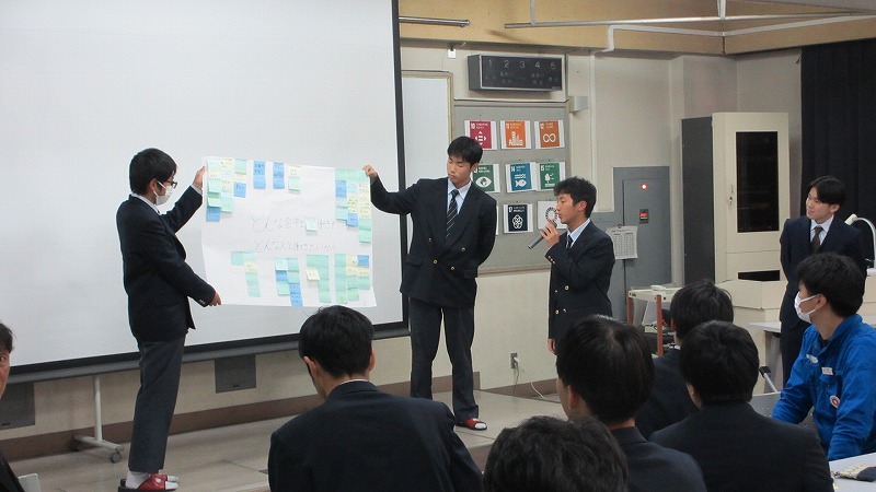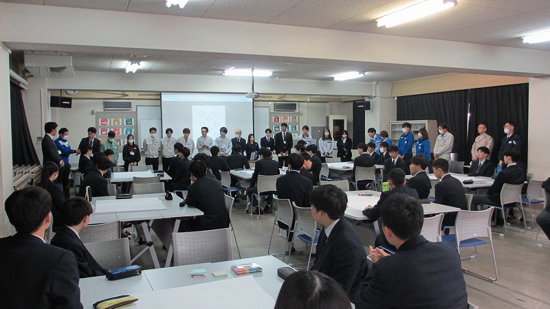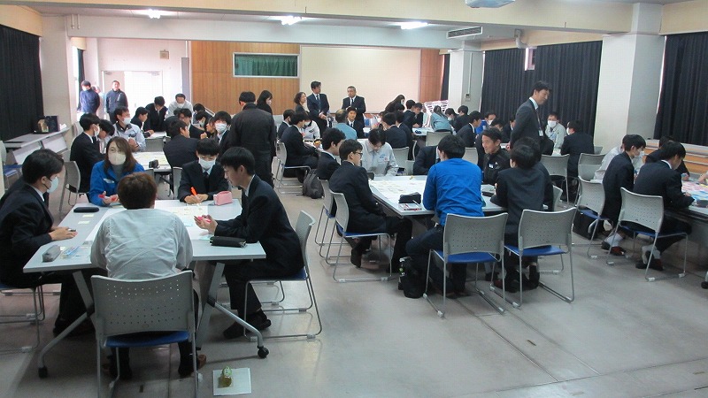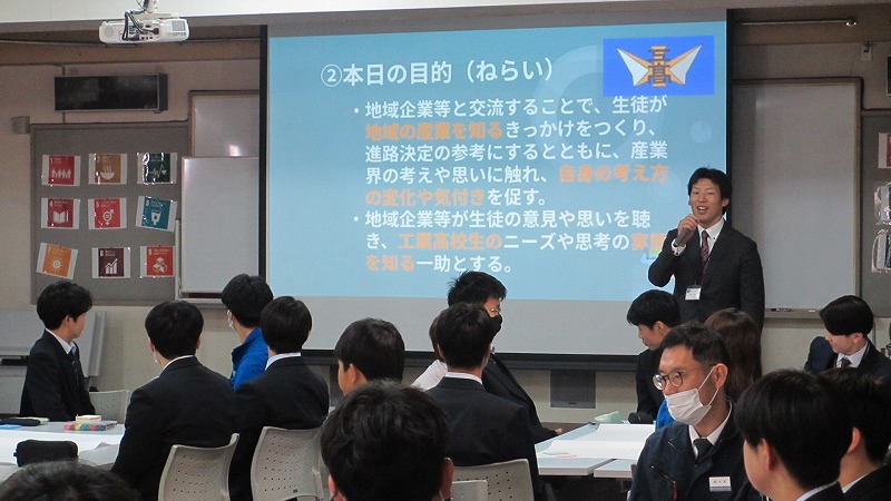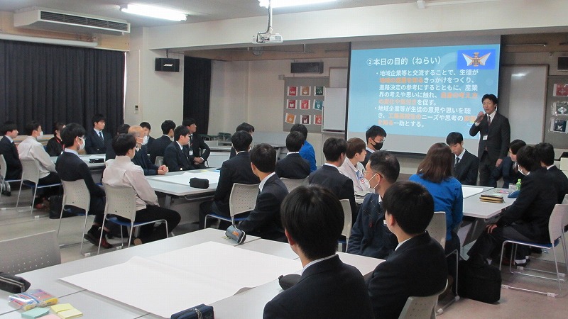 機械科2年生を対象とした、地域企業との交流会を実施しました。この、交流会は、生徒が地域産業を知るきっかけをつくり、進路決定の参考にするとともに、企業側は生徒の考えや意見を聞き、工業高校生のニーズや実態を知る機会としていただくものです。