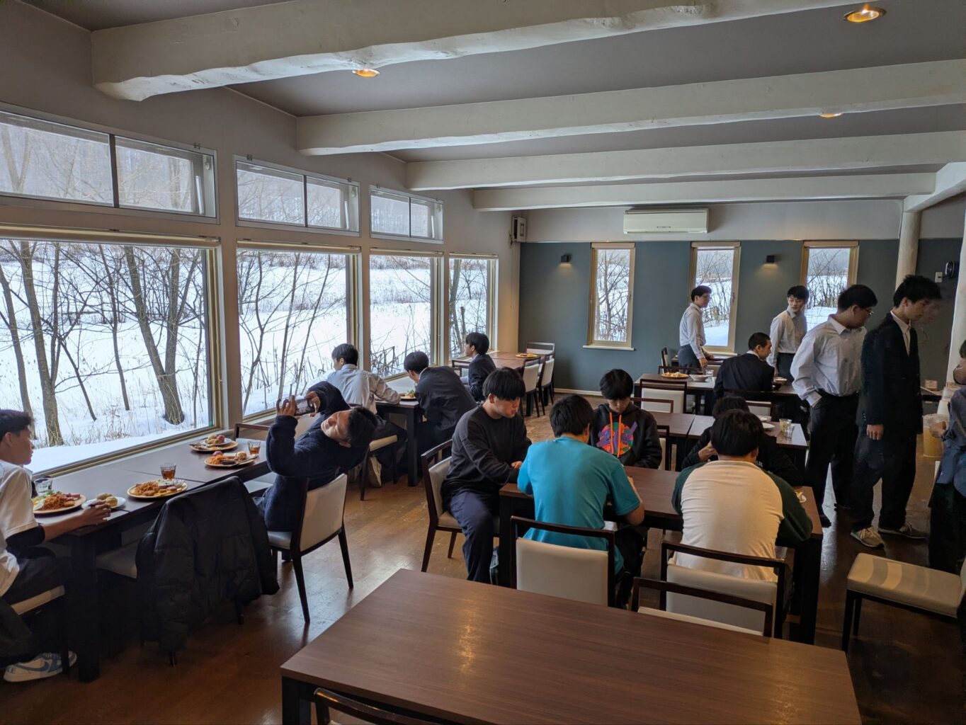 雪景色の中朝食を食べています。