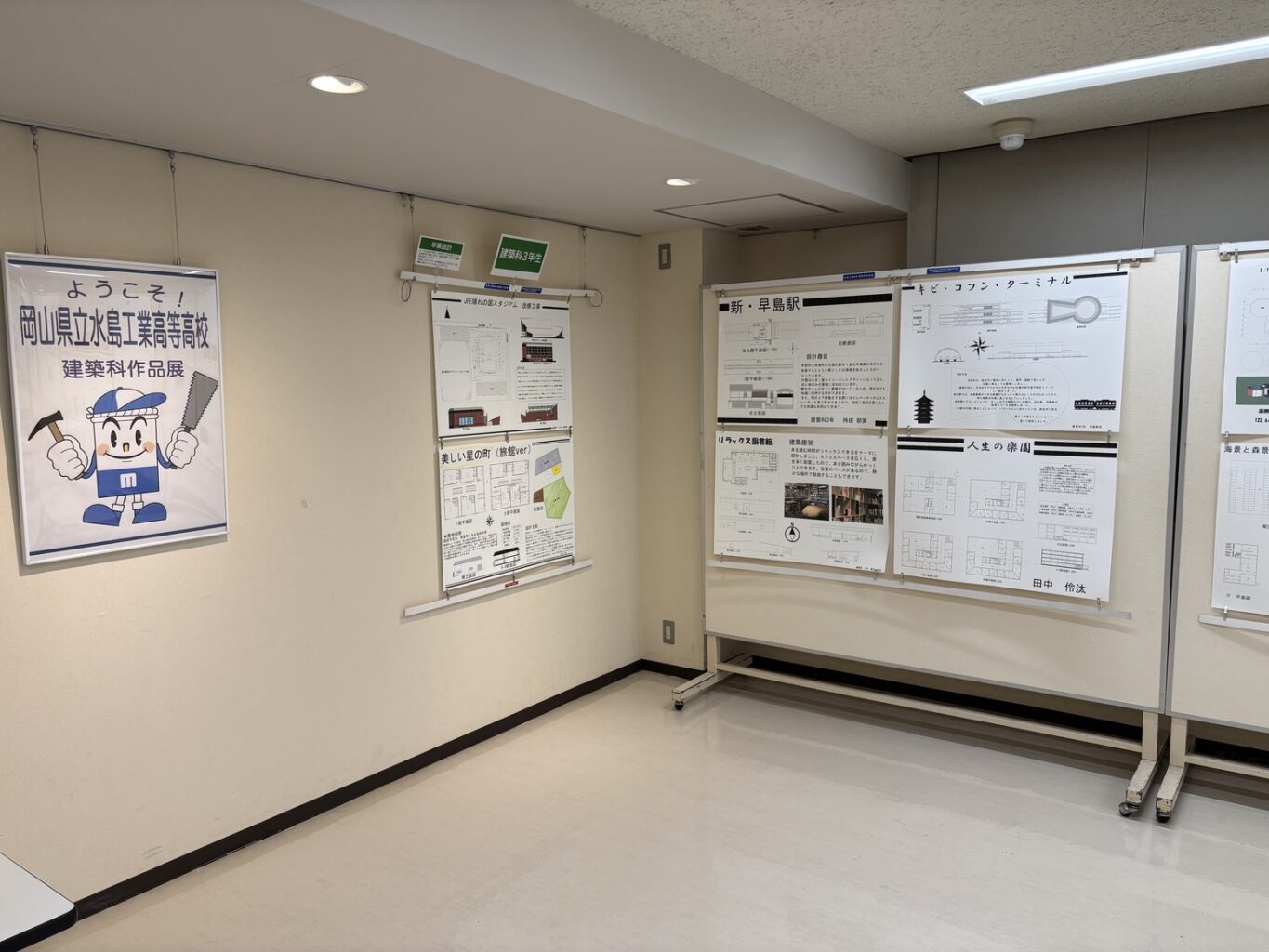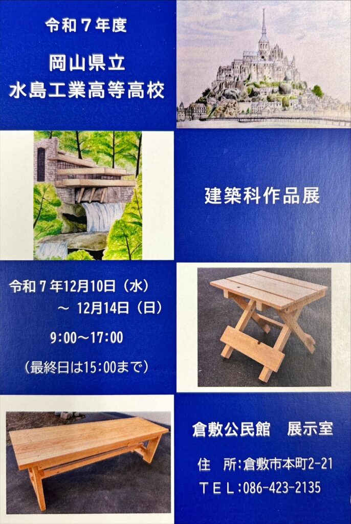 12月10日(水)~14日(日) 倉敷公民館展示室を会場に『建築科作品展』を開催します。この作品展は毎年、建築科の生徒が日頃描いている図面や実習等で作成した作品などを展示するものです。今年度も3年生の卒業設計をはじめ、木工作品、模型作品、各種図面などを展示します。美観地区周辺にお越しの際はぜひ、倉敷公民館にお立ち寄りいただき、生徒の力作をご覧ください。
