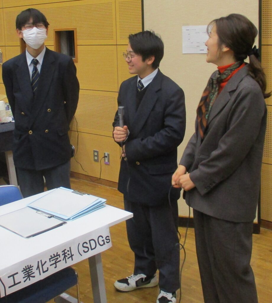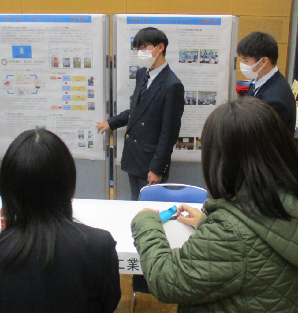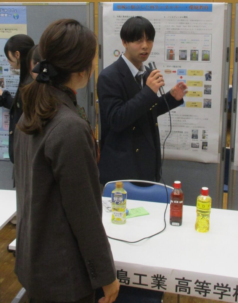 工業化学科3年生、課題研究SDGs班は12月13日に「STOP温暖化くらしき」に参加しました。工業化学科では地域協力の下、廃食用油の回収を行いディーゼル代替燃料の製造と発電を行っています。また、小学生環境教育では廃食用油を使用した廃油石けんづくりを指導しており、環境活動・リサイクル活動への取り組みをポスターセッションにおいて参加者へ説明しました。また、渋沢寿一氏の講演において「森から考える、私たちの未来」を拝見し環境問題への新たな取り組みが必要であることを学ぶ機会となりました。