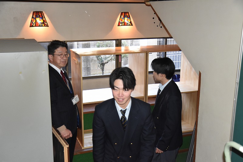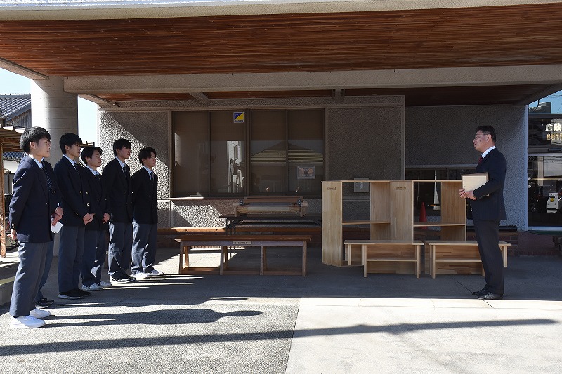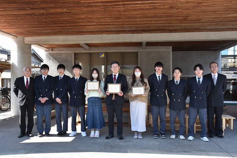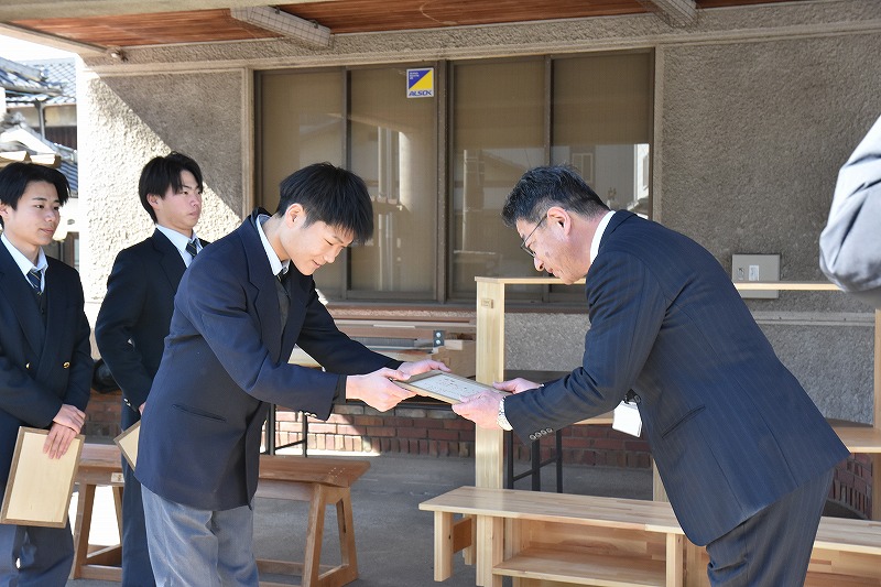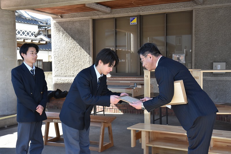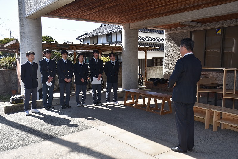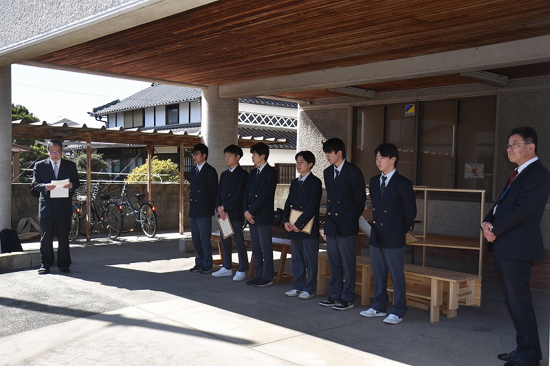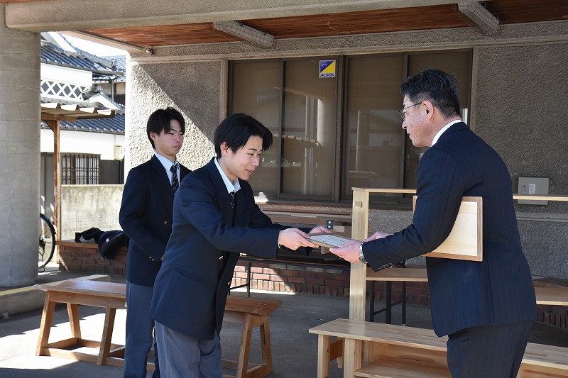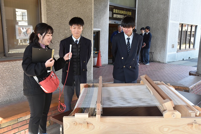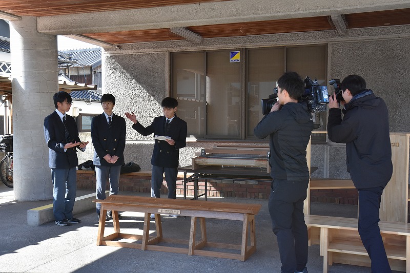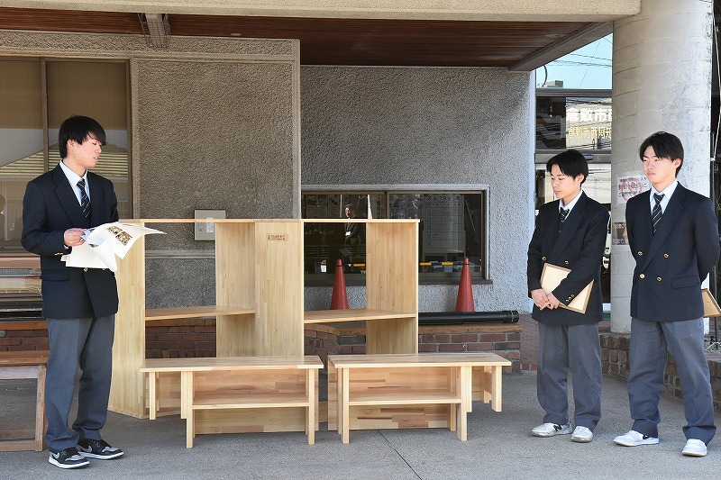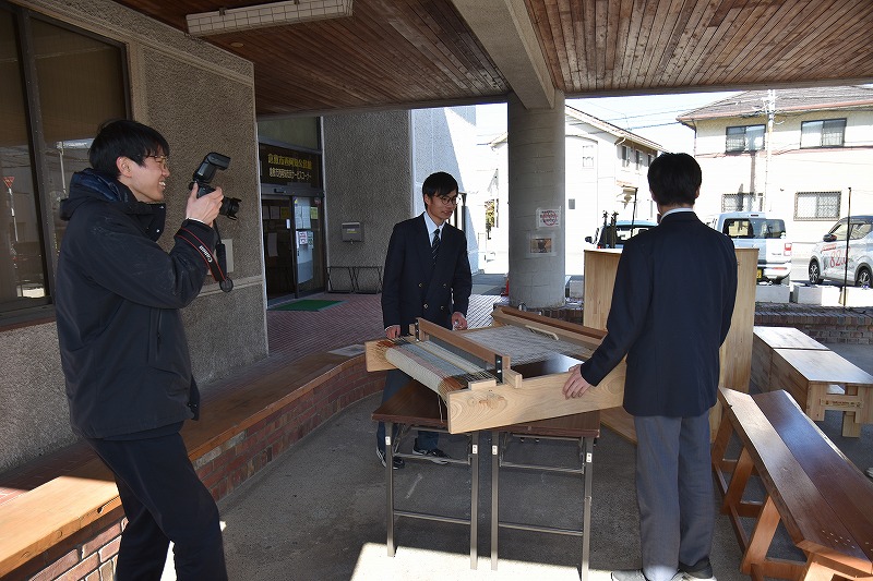 建築科では、地域をフィールドとして「ものづくり」による地域連携活動に取り組んでいます。今年度は、西阿知公民館と連携して公民館の利用者に使っていただく、い草を使った茣蓙(ござ)織機やベンチ、棚などの木工製品を3年生の課題研究(PBL型学習)の授業で製作しました。本日、西阿知公民館で贈呈式を行いました。その際には、山陽新聞、倉敷ケーブルテレビ、FMくらしきの取材もありました。
